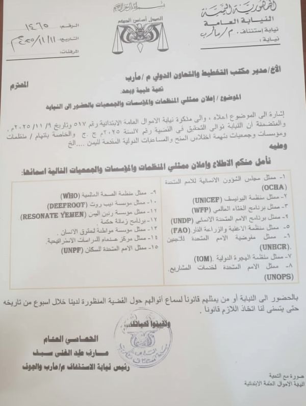 وجهت نيابة الاستئناف بمحافظة مأرب، شمال شرق البلاد، مذكرة رسمية إلى مكتب التخطيط والتعاون الدولي، تطلب فيها حضور ممثلي عدد من المنظمات الأممية والدولية والمحلية، في إطار تحقيقات جارية بقضية اختلاس منظورة أمامها.