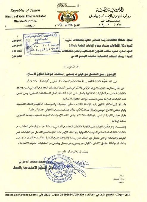 أصدرت وزارة الشؤون الاجتماعية والعمل في الحكومة اليمنية المعترف بها دوليًا، يوم الثلاثاء، تعميمًا رسميًا يقضي بمنع التعامل مع منظمة "مواطنة لحقوق الإنسان" داخل مناطق سيطرة الحكومة.