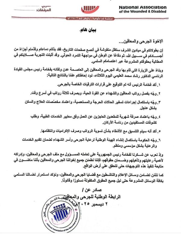 وفي ختام البيان، أعربت الرابطة عن شكرها للرئيس على تعامله المسؤول مع ملف الجرحى والمعاقين، مؤكدة استمرارها في متابعة تنفيذ هذه التوجيهات حتى تتحقق على أرض الواقع، مشددة على مواصلة النضال السلمي بكافة الوسائل المشروعة حتى نيل جميع الحقوق المكفولة دستورًا وقانونًا.