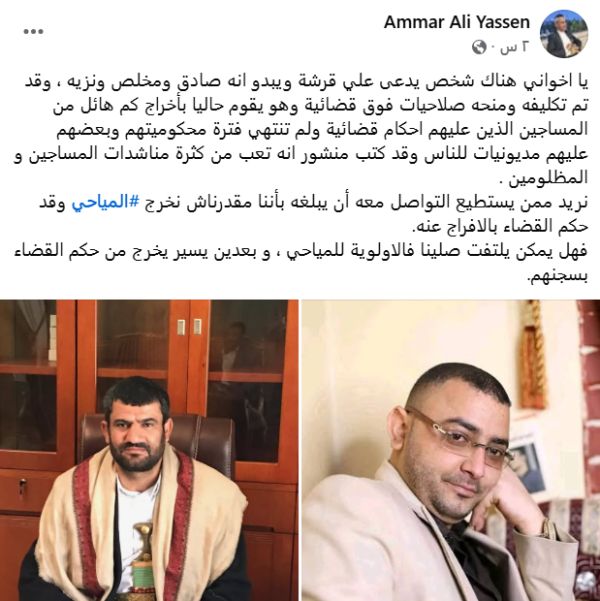 وقال المحامي الأهدل، في منشور على صفحته بمواقع التواصل الاجتماعي، إن شخصًا يُدعى علي قرشة، مُنح صلاحيات وصفها بـ«فوق القضائية»، يقوم بالإفراج عن عدد من السجناء، بعضهم صدرت بحقهم أحكام قضائية ولم تنتهِ مدة محكومياتهم، وآخرون عليهم مديونيات للغير، مؤكدًا أن الصحفي المياحي لا يزال محتجزًا رغم صدور حكم قضائي صريح بالإفراج عنه.